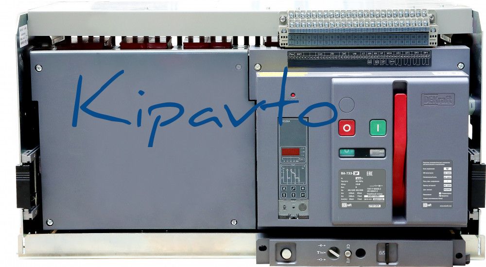 Воздушный автоматический выключатель серии ВА-733 DEKraft - 3P, номинальный ток 4000 А - отключающая способность 120 кА, выкатной, блок управления типа M - присоединения задние горизонтальные. В базовую комплектацию входят моторный привод (230 В пер.тока), 4 контакта состояния ВКЛ/ОТКЛ, сигнальный контакт, электромагнит включения (230 В пер.тока), независимый расцепитель (230 В пер.тока), сигнальный контакт положения аппарата в корзине, разделители полюсов и рамка передней панели.