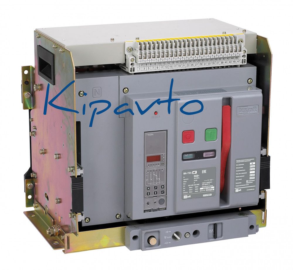 Воздушный автоматический выключатель серии ВА-731 DEKraft - 4P, номинальный ток 1000 А - отключающая способность 80 кА, выкатной, блок управления типа M - присоединения задние горизонтальные. В базовую комплектацию входят моторный привод (230 В пер. тока), 4 контакта состояния ВКЛ/ОТКЛ, сигнальный контакт, электромагнит включения (230 В пер. тока), независимый расцепитель (230 В пер. тока), сигнальный контакт положения аппарата в корзине, разделители полюсов и рамка передней панели.