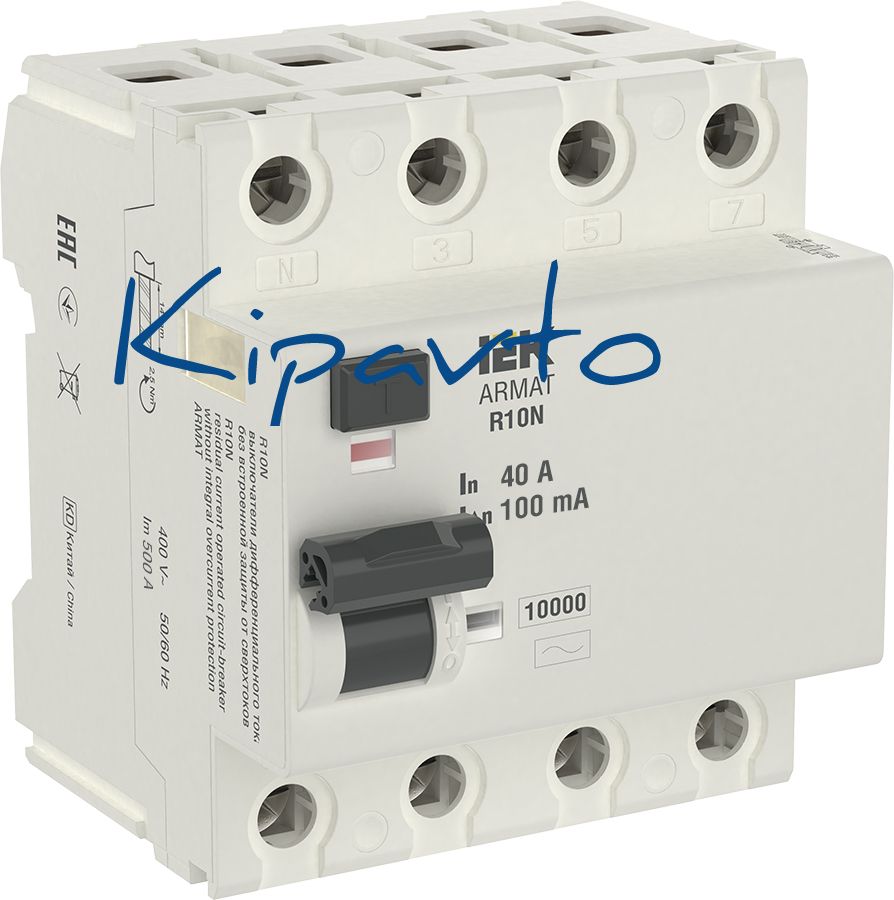 Выключатели дифференциального тока ARMAT серии R10N выполняют функцию защиты поражения человека электрическим током, а так же защиты от пожара при возникновении замыкания на землю. Модельный ряд включает в себя устройства с типами защитных характеристик по дифференциальному току AC, A, AC-S, A-S, номинальными токами от 25 до 100 А, номинальными дифференциальными токами срабатывания от 10 до 300мА. Условная отключающая способность ВДТ ARMAT серии R10N составляет 10 кА.