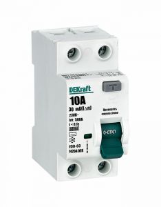 Выключатель дифференциального тока (ВДТ) серии УЗО-03 Dekraft, 2P, номинальный ток 10А, номинальный дифференциальный ток 30 мА, блок дифференциальной защиты – электромеханический, тип дифференциального расцепителя - AC, ширина – 2 мод. х 18 мм, монтаж – на 35 мм DIN-рейку. Уставка тока утечки 30 мА обеспечивает защиту людей при прямом и косвенном прикосновении. Электромеханический выключатель дифференциального тока (ВДТ) разомкнет цепь даже при повреждении «нулевого» провода либо значительном падении напряжения. При сборке выключатель дифференциального тока (ВДТ) и автоматический выключатель (ВА) для его защиты устанавливаются последовательно, номинальный ток УЗО-03 NEW 6кА должен быть равен номинальному току автоматического выключателя (ВА).