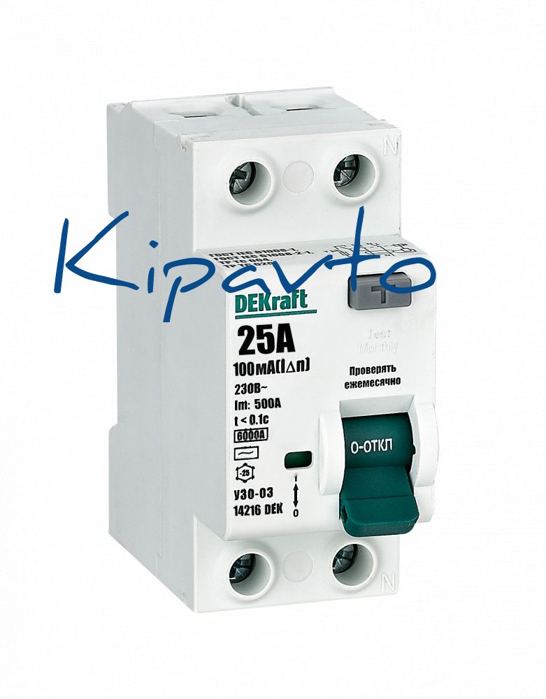 Выключатель дифференциального тока (ВДТ) серии УЗО-03 Dekraft, 2P, номинальный ток 25А, номинальный дифференциальный ток 100 мА, блок дифференциальной защиты – электромеханический, тип дифференциального расцепителя - AC, ширина – 2 мод. х 18 мм, монтаж – на 35 мм DIN-рейку. Уставка тока утечки 100 мА обеспечивает защиту людей от поражения электрическим током при косвенном прикосновении. Электромеханический выключатель дифференциального тока (ВДТ) разомкнет цепь даже при повреждении «нулевого» провода либо значительном падении напряжения. При сборке выключатель дифференциального тока (ВДТ) и автоматический выключатель (ВА) для его защиты устанавливаются последовательно, номинальный ток УЗО-03 NEW 6кА должен быть равен номинальному току автоматического выключателя (ВА).