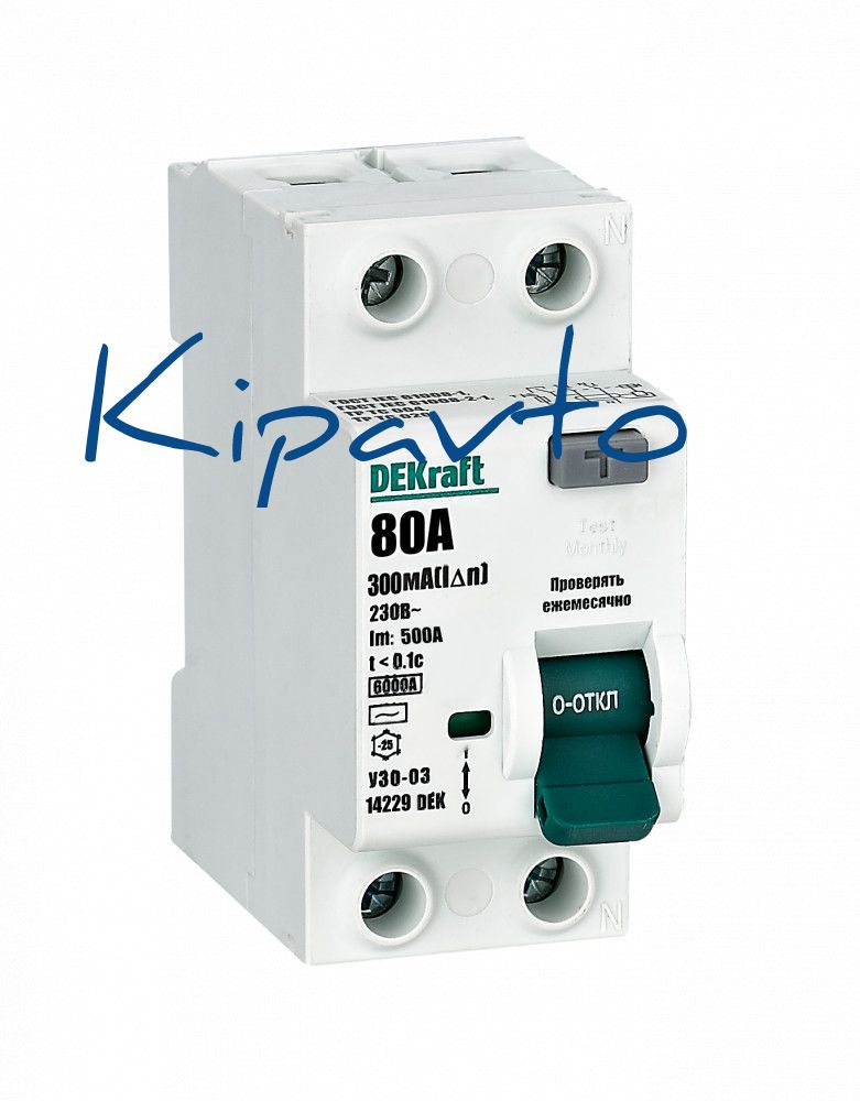Выключатель дифференциального тока (ВДТ) серии УЗО-03 Dekraft, 2P, номинальный ток 80А, номинальный дифференциальный ток 300 мА, блок дифференциальной защиты – электромеханический, тип дифференциального расцепителя - AC, ширина – 2 мод. х 18 мм, монтаж – на 35 мм DIN-рейку. Уставка тока утечки 300 мА обеспечивает защиты людей от поражения электрическим током при косвенном прикосновении, сборки от возгорания из-за тока утечки. Электромеханический выключатель дифференциального тока (ВДТ) разомкнет цепь даже при повреждении «нулевого» провода либо значительном падении напряжения. При сборке выключатель дифференциального тока (ВДТ) и автоматический выключатель (ВА) для его защиты устанавливаются последовательно, номинальный ток УЗО-03 NEW 6кА должен быть равен номинальному току автоматического выключателя (ВА).