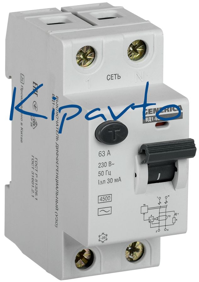 Быстродействующий защитный выключатель ВД1-63 (УЗО) GENERICA - устройство электронного типа, зависящее от напряжения и реагирующее на дифференциальный ток, без встроенной защиты от сверхтоков. Предназначен для защиты человека от поражения электрическим током.