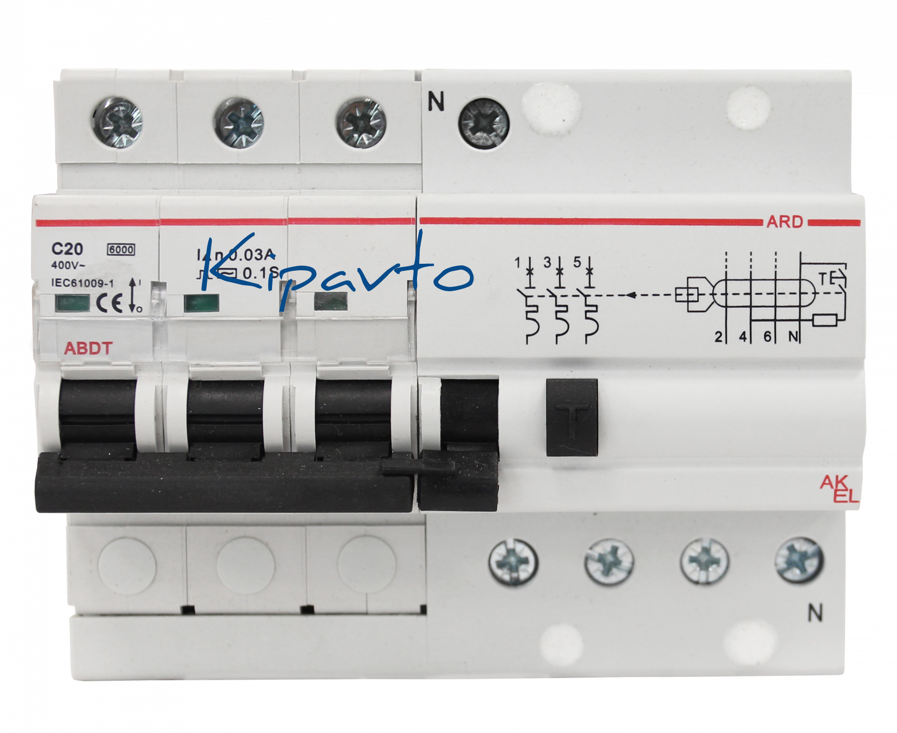 Выключатель дифференциальный автоматический АВДТ-ARD-3P+N-C20-30mA-ТипAC 3P+N/20A/C/AC/30mA/6kA