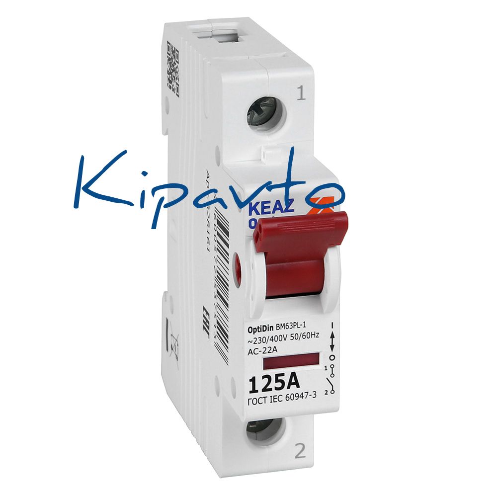 Модульный 1 полюсный выключатель нагрузки переменного тока на номинальный ток 125 А. Модульные выключатели нагрузки OptiDin ВМ63Р производства КЭАЗ используются только для коммутации цепей в вводно-распределительных щитках, как общий выключатель всей квартирной цепи. Модульные выключатели нагрузки обеспечивают самый надежный разрыв цепи.