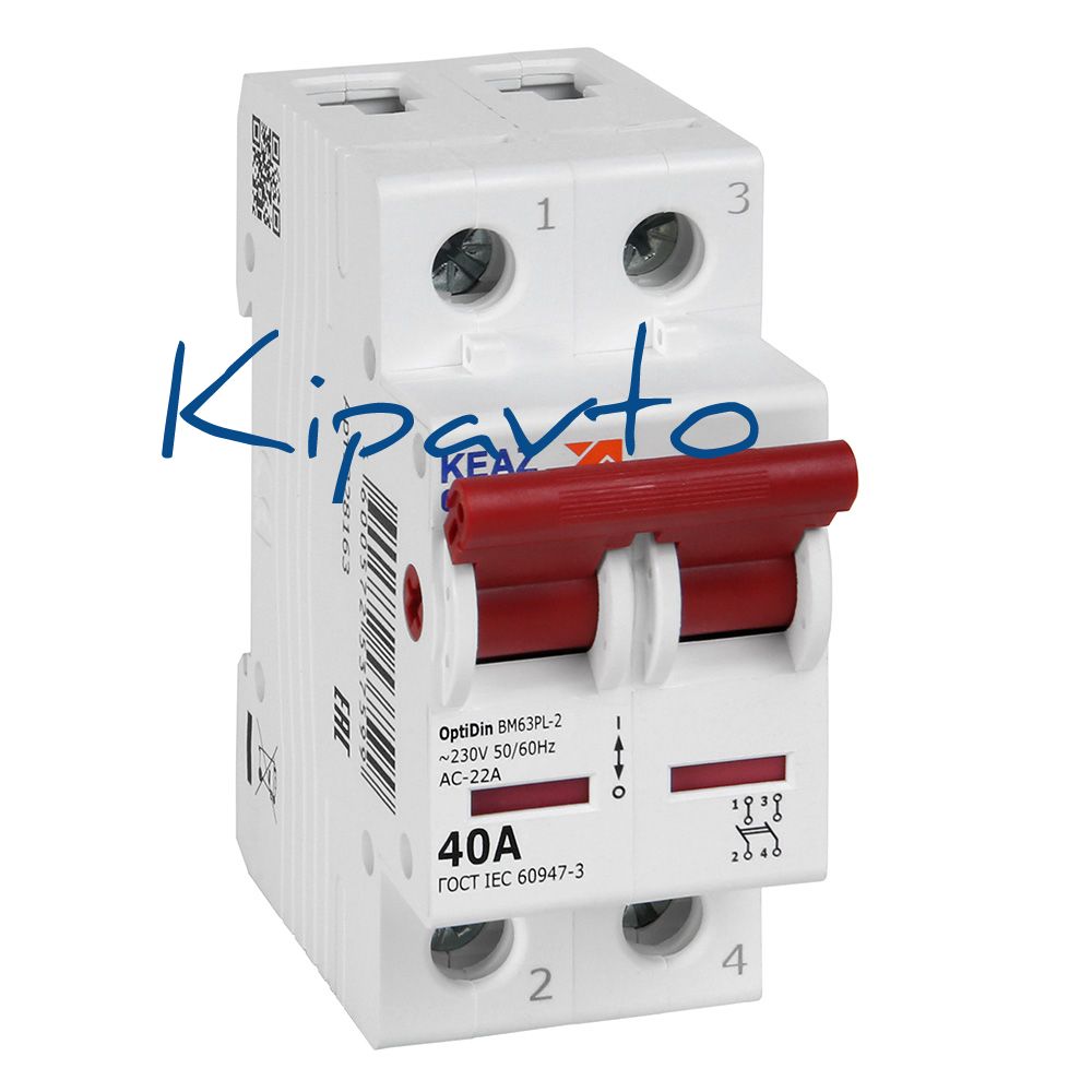 Модульный 2 полюсный выключатель нагрузки переменного тока на номинальный ток 40 А. Модульные выключатели нагрузки OptiDin ВМ63Р производства КЭАЗ используются только для коммутации цепей в вводно-распределительных щитках, как общий выключатель всей квартирной цепи. Модульные выключатели нагрузки обеспечивают самый надежный разрыв цепи.