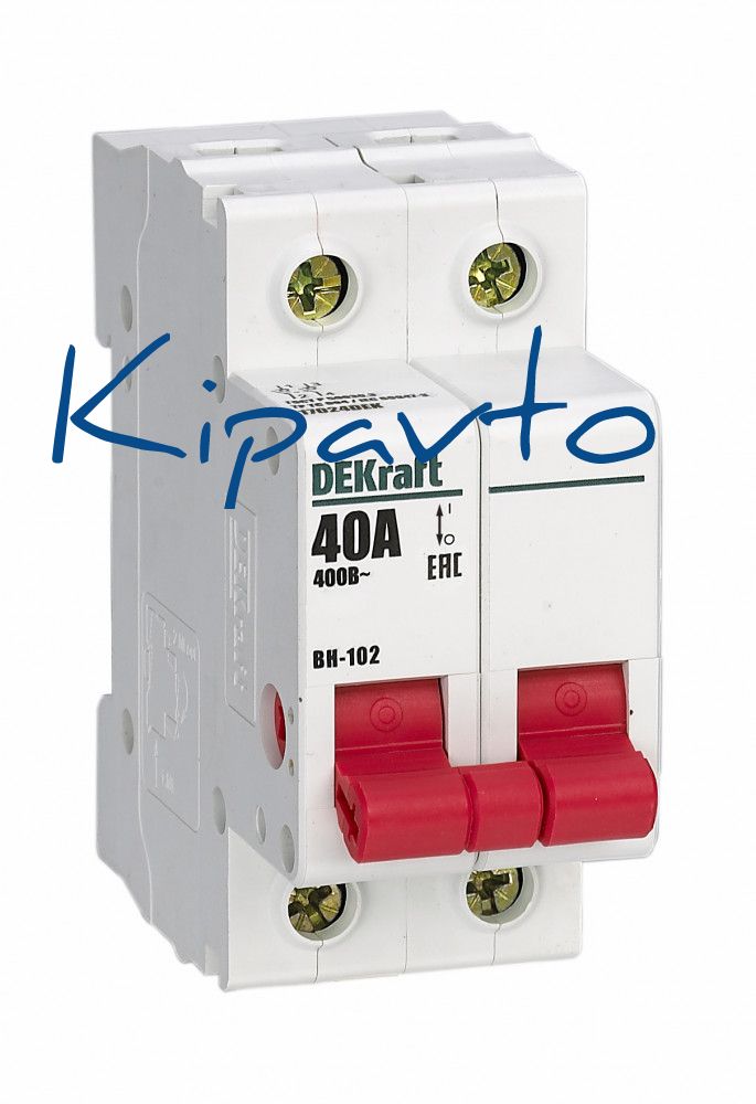 Выключатель-разъединитель серии ВН-102 DEKraft, 2P, номинальный ток 40 А, установка - на DIN-рейку, установочное положение - любое. Выключатели-разъединители применяются для ручного включения/отключения сетей напряжением до 400 В. Специальные мостиковые контакты обеспечивают надежный разрыв цепи, они полностью исключают возможность перекрытия дугой по изоляции. Усиленная рукоятка управления обеспечивает большое количество включений/отключений.