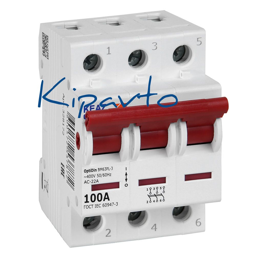 Модульный 3 полюсный выключатель нагрузки переменного тока на номинальный ток 100 А. Модульные выключатели нагрузки OptiDin ВМ63Р производства КЭАЗ используются только для коммутации цепей в вводно-распределительных щитках, как общий выключатель всей квартирной цепи. Модульные выключатели нагрузки обеспечивают самый надежный разрыв цепи.