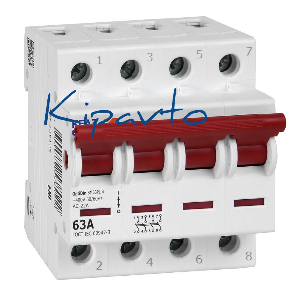 Модульный 4 полюсный выключатель нагрузки переменного тока на номинальный ток 63 А. Модульные выключатели нагрузки OptiDin ВМ63Р производства КЭАЗ используются только для коммутации цепей в вводно-распределительных щитках, как общий выключатель всей квартирной цепи. Модульные выключатели нагрузки обеспечивают самый надежный разрыв цепи.