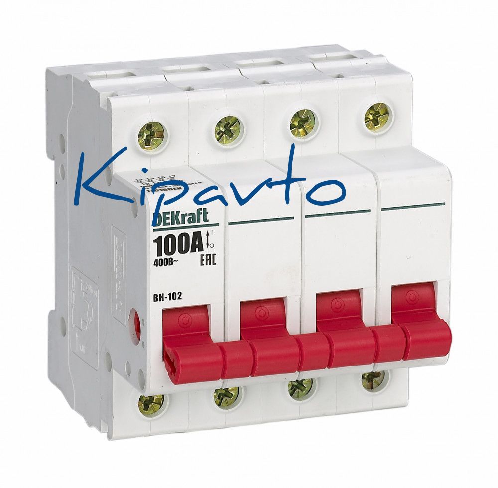 Выключатель-разъединитель серии ВН-102 DEKraft, 4P, номинальный ток 100 А, установка - на DIN-рейку, установочное положение - любое. Выключатели-разъединители применяются для ручного включения/отключения сетей напряжением до 400 В. Специальные мостиковые контакты обеспечивают надежный разрыв цепи, они полностью исключают возможность перекрытия дугой по изоляции. Усиленная рукоятка управления обеспечивает большое количество включений/отключений.