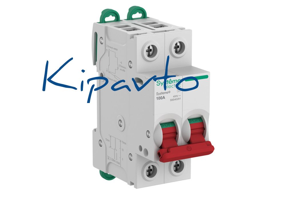 Выключатель-разъединитель S9S, серии Systeme9, Systeme Electric, 2-полюсный, номинальный ток 100 А, с красной рукояткой управления. Соответствует требованиям стандартов ГОСТ IEC 60947-3 и ГОСТ IEC 60669-2-4. Применяется в электрических сетях напряжением 400 В. Предназначен для включения и отключения нагрузок в электрических сетях. Категория применения AC-22A. Оснащен двойными безопасными клеммами раздельного монтажа проводников. Монтируется на DIN-рейку при помощи двухпозиционных защёлок, с возможностью демонтажа без снятия шины PIN.