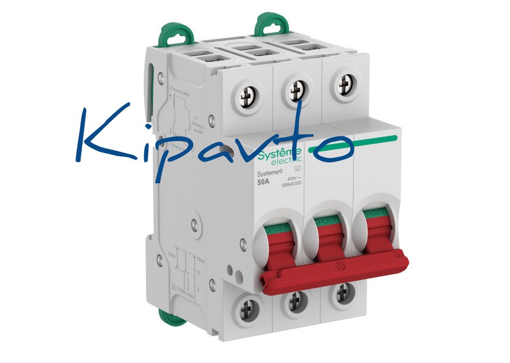 Выключатель-разъединитель S9S, серии Systeme9, Systeme Electric, 3-полюсный, номинальный ток 50 А, с красной рукояткой управления. Соответствует требованиям стандартов ГОСТ IEC 60947-3 и ГОСТ IEC 60669-2-4. Применяется в электрических сетях напряжением 400 В. Предназначен для включения и отключения нагрузок в электрических сетях. Категория применения AC-22A. Оснащен двойными безопасными клеммами раздельного монтажа проводников. Монтируется на DIN-рейку при помощи двухпозиционных защёлок, с возможностью демонтажа без снятия шины PIN.