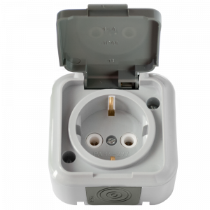 Розетка штепсельная с заземляющим контактом брызгозащищенная открытой установки, предназначена для присоединения электрических приемников с номинальным напряжением 250 В к электрической сети переменного тока. Электротехнические свойства механизма полностью соответствуют номинальным токовым показателям отечественных энергетических линий. Надёжная контактная группа. Изделие выдерживает 20 А. В качестве материала для производства изделия использовался специальный очень прочный и экологически безопасный полимер. Изделие надёжно защищено от разрушительного воздействия ультрафиолетового излучения, не претерпевает видимых изменений при постоянных многочисленных эксплуатационных контактах.