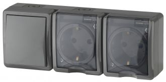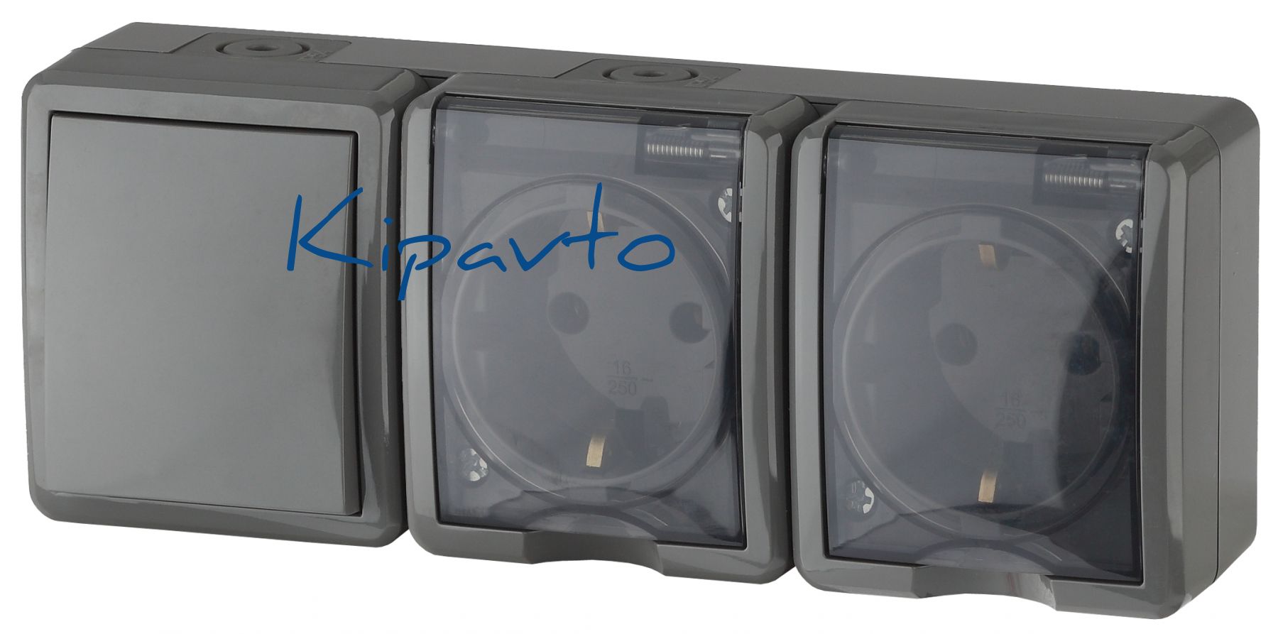 Блок две розетки+выключатель IP54, 16A(10AX)-250В, ОУ, Эра Эксперт, серый, 11-7403-03