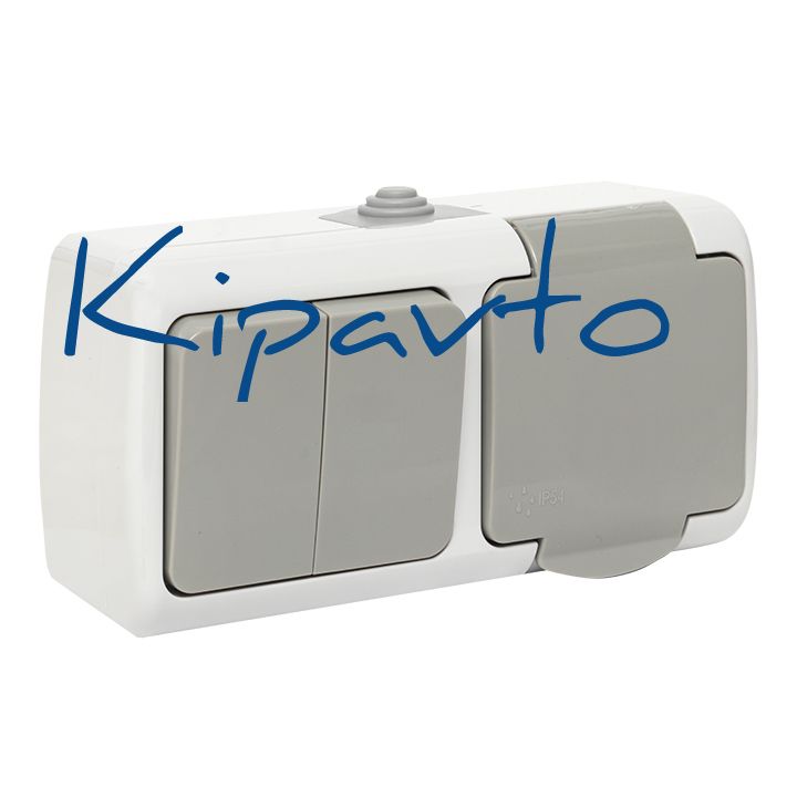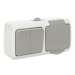 Блок розетка Мурманск 1-м 16А с заземлением с крышкой + двухклавишный выключатель IP54 серый