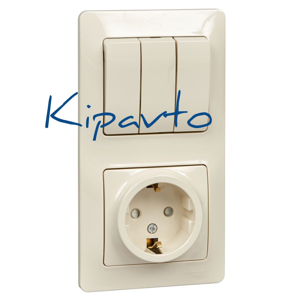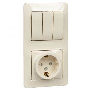Блок: розетка с заземлением со шторками + выключатель трехклавишный бежевый