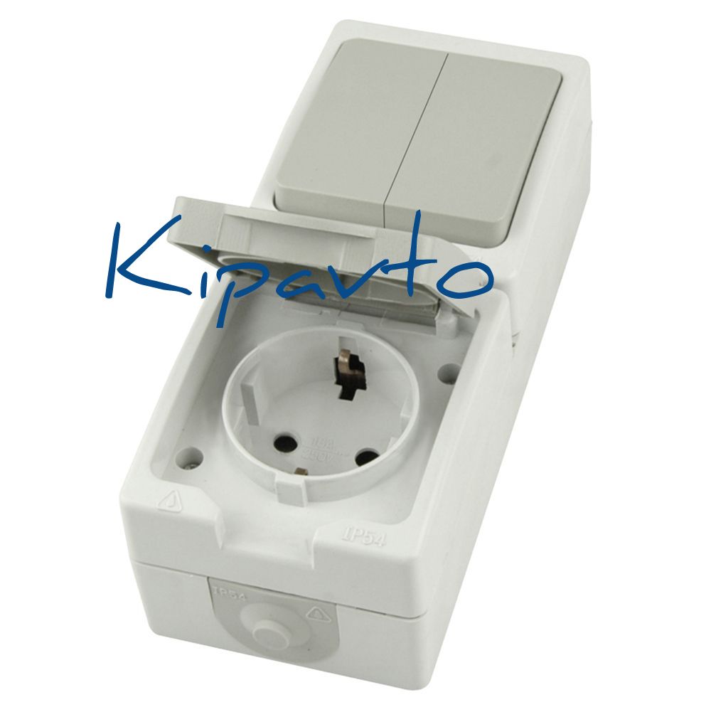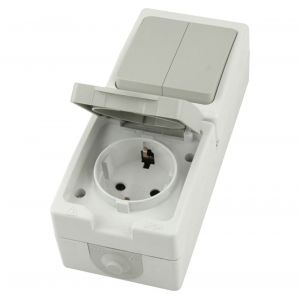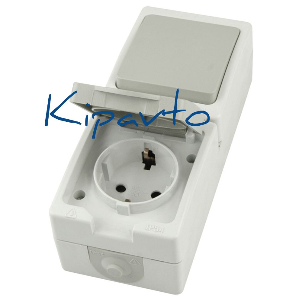 Блок вертикальный розетка 1-мест с/з 250В 16А+выкл 2-клав. 250В 10А IP54 белый/серый STEKKER