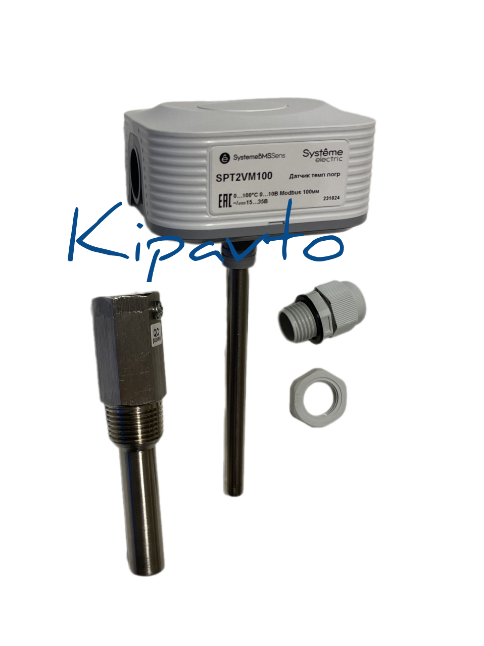 Датчик температуры погружной, диапазон измерения температуры 0…+100°С, выходной сигнал 0…10В, RS485/Modbus 100мм напряжение питания 24 В переменного тока±20%/-15…35В, в комплект поставки входит гильза 50 мм