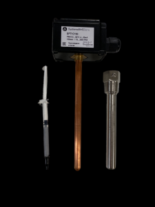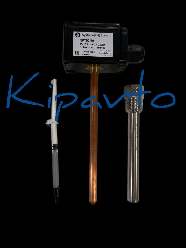 Датчик температуры погружной, диапазон измерения температуры 0…+50°С, выходной сигнал 4…20 мА, длина погружной части 150 мм, напряжение питания 15…35 В постоянного тока, в комплект поставки входит гильза 100 мм
