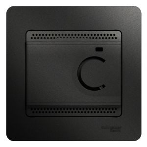 Термостат Schneider Electric Glossa (в сборе, цвет антрацит) электронный для тёплого пола с датчиком на ток до 10 А. Диапазон температур: от +5 до +50 °C. Термостат контролирует температуру теплого пола путем регулировки температуры нагревательных кабелей, вмонтированных в пол. Термостат включается с помощью выключателя, расположенного на передней панели. Выполнен из материала PС+ASA, стойкого к УФ-излучению и появлению царапин.