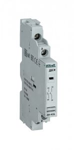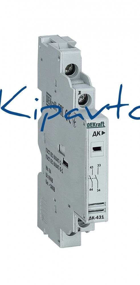 Дополнительный контакт серии ДК-431 DEKraft, ном. раб. ток до 6 А, кол-во и тип контактов - 2НО, установка с левой стороны автомата. Контакт дополнительный серии ДК-431 выполняет функцию контакта состояния автоматического выключателя защиты двигателя серии ВА-431: включен - выключен. Переключение контактов происходит, даже если рукоятка управления выключателя удерживается во взведенном положении.