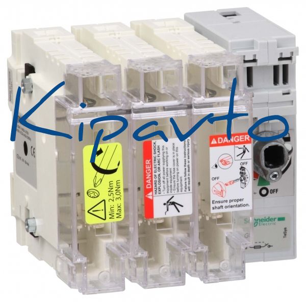 Корпус выключателя-разъединителя-предохранителя серии GS TeSys Schneider Electric для использования с предохранителями NF C или DIN, номинальный ток 100 А, 3Р, размер плавкой вставки - 22х58 мм, тип рукоятки - выносная фронтальная или правая.