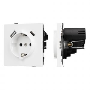 Механизм розетки с USB зарядкой, совместимый с рамками серии TENDO, создает утонченный минималистичный вид. Наличие двух USB Type A + Type C портов позволяет существенно сократить количество используемых розеточных постов под евровилку, сохраняя единую стилистику интерьера всего современного дизайн-проекта. Видимая часть механизма выполнена из высококачественного пластика белого цвета и имеет матовое покрытие, что придает изделию приятные тактильные ощущения и стильный внешний вид. Розетка оснащена заземляющими контактами и защитными шторками, обеспечивая надежное и безопасное подключение электроприборов. Суппорт окрашен в черный матовый цвет под основу механизма и выполнен из металла толщиной 1,5мм, что обеспечивает безопасность и уверенность в установке. На каждой стороне суппорта размещены фиксирующие элементы, позволяющие комбинировать механизмы в системы до 5шт как горизонтально, так и вертикально.