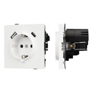 Механизм розетки с USB зарядкой, совместимый с рамками серии TENDO, создает утонченный минималистичный вид. Наличие двух USB Type A + Type C портов позволяет существенно сократить количество используемых розеточных постов под евровилку, сохраняя единую стилистику интерьера всего современного дизайн-проекта. Видимая часть механизма выполнена из высококачественного пластика белого цвета и имеет Soft-Touch покрытие, что придает изделию приятные тактильные ощущения и стильный внешний вид. Розетка оснащена заземляющими контактами и защитными шторками, обеспечивая надежное и безопасное подключение электроприборов. Суппорт окрашен в черный матовый цвет под основу механизма и выполнен из металла толщиной 1,5мм, что обеспечивает безопасность и уверенность в установке. На каждой стороне суппорта размещены фиксирующие элементы, позволяющие комбинировать механизмы в системы до 5шт как горизонтально, так и вертикально.