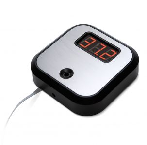 Пирометр PERCo-AT01 предназначен для бесконтактного измерения температуры открытых участков тела человека, например, запястья или ладони на проходных предприятий, административных учреждений, транспортных объектов и т.п. Пирометр работает в качестве внешнего верифицирующего устройства совместно с турникетом или замком в составе систем контроля доступа. Система позволяет задать порог нормальной температуры тела, при превышении которого турникет или замок не откроется для прохода. Пирометр представляет собой блок в металлическом корпусе, на передней панели которого расположен трехзначный светодиодный индикатор с разделительными точками и окно датчика температуры. Пирометр имеет встроенную звуковую индикацию. Факт измерения температуры объекта подтверждается кратковременным звуковым сигналом