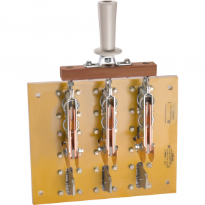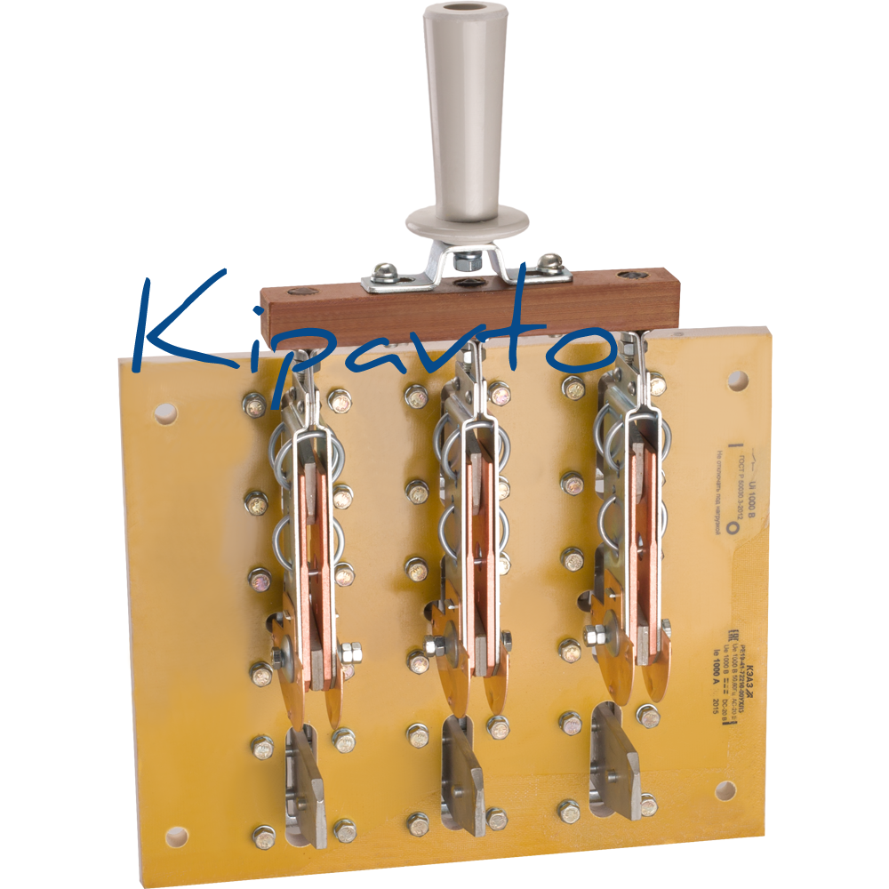 Разъединитель 2 полюсный на номинальный ток 2500 А, где установлена несъемная рукоятка, а механическая износостойкость составляет 4000 циклов. Разъединители РЕ19 предназначены для пропускания номинальных токов и нечастых (до трех раз) неавтоматических коммутаций электрических цепей без нагрузки номинальным напряжением до 1000 В переменного тока частоты 50, 60 Гц и номинальным напряжением до 1000 В постоянного тока в устройствах распределения электрической энергии.