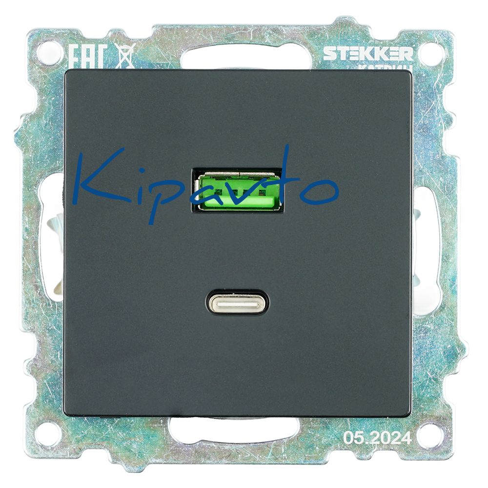 Розетка 2-местная USB+TypeC (механизм) 250В 3А max 20W серия Катрин черный STEKKER