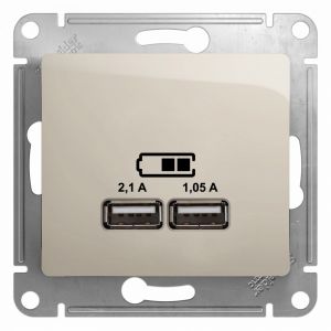 Механизм Systeme Electric (ранее Schneider Electric) серии Glossa (цвет молочный) розетки с двумя разъёмами USB с выходными напряжением 5 В постоянного тока и выходами с номинальным током по 2,1 А. Предназначен для зарядки мобильных устройств: телефоны, планшетные компьютеры, mp3/mp4 плееры. Может заряжать одно или два устройства одновременно. Выполнен из материала PС+ASA, стойкого к УФ-излучению и появлению царапин.
