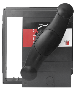 Стационарная поворотная рукоятка РПС ВА55-PRO 1600AF обеспечивает доступ к регулировкам расцепителя и возможность их считывания. Она гарантирует надежное отключение автоматического выключателя и имеет индикацию трех состояний - ''откл.'', ''вкл.'' и ''авар. откл.''. Кроме того, рукоятка обеспечивает доступ к кнопке тестирования отключения с функцией ''push to trip''.