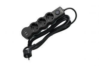 Бытовой удлинитель черного цвета с кнопкой включения и USB для питания и зарядки устройств, корпус выполнен из прочного ABS пластика с 3 гнёздами, 10 А, 1.5м ПВС провод 3х1 мм2, темп. Эксплуатации от +1 до +35 °C, ном. Частота 50 Гц, напряжение 220В, IP20, макс. Мощность 10А 2500 Вт, предельно допустимая 2800 Вт. Китай.