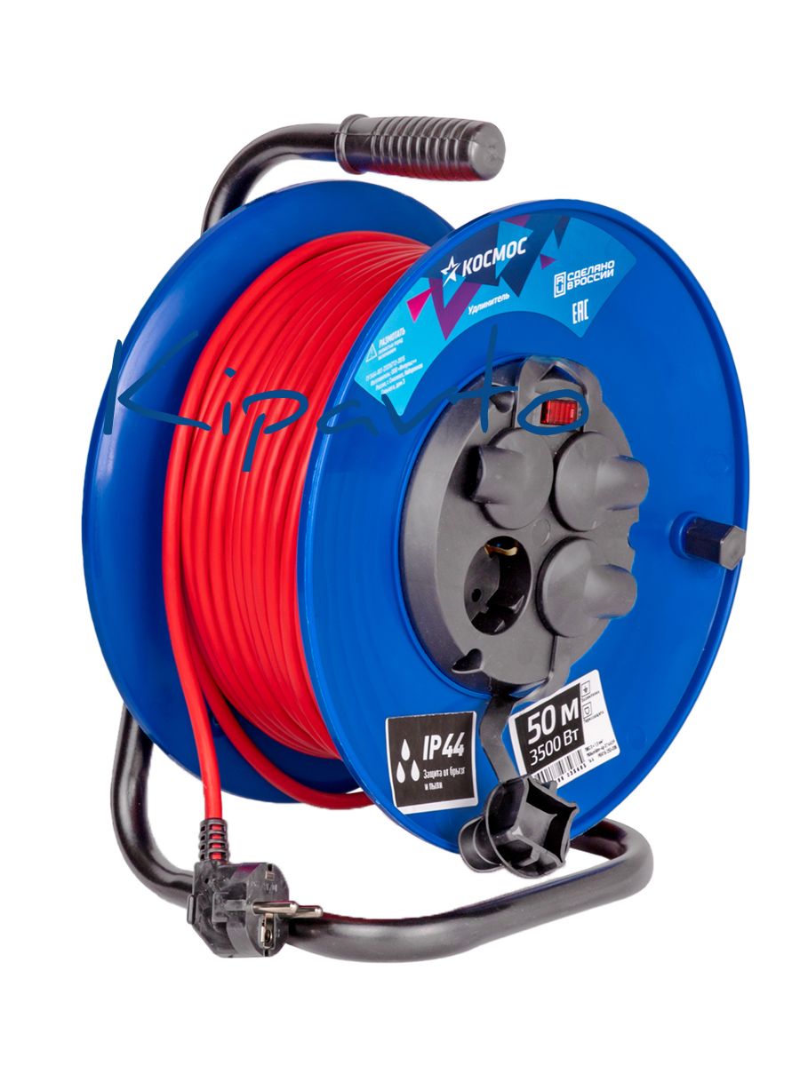 Катушка из прочного пластика в ярком, заметном цвете, защита от пыли и влаги по стандарту IP44 с резиновыми крышками, провод ПВС с яркой окраской и заземляющей жилой и максимальной мощностью нагрузки 3500Вт. Специальный провод ПВС пониженной пожарной опасности с уменьшенным дымо и газовыделением и повышенной масло-бензостойкостью.