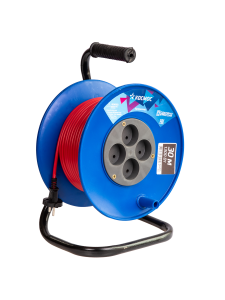 Надежная катушка удлинитель из прочного пластика, c металлической ножкой, провод ПВС без заземления с сечениями 2x0,75 мм и максимальной мощностью нагрузки 1300 Вт.