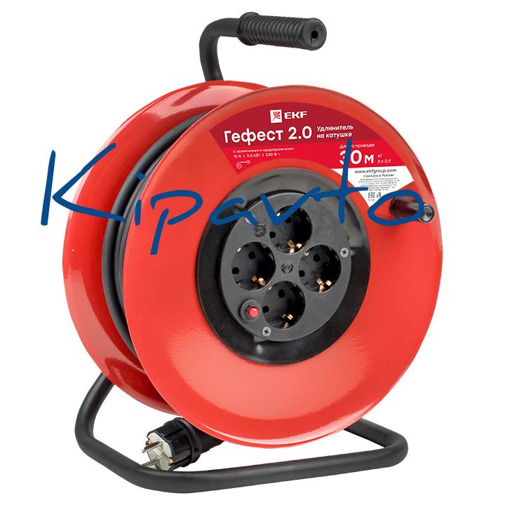 Удлинитель на катушке Гефест 2.0 4 гнезда 30м с заземлением и предохранителем КГ 3x2.5 16А/3.5кВт PROxima