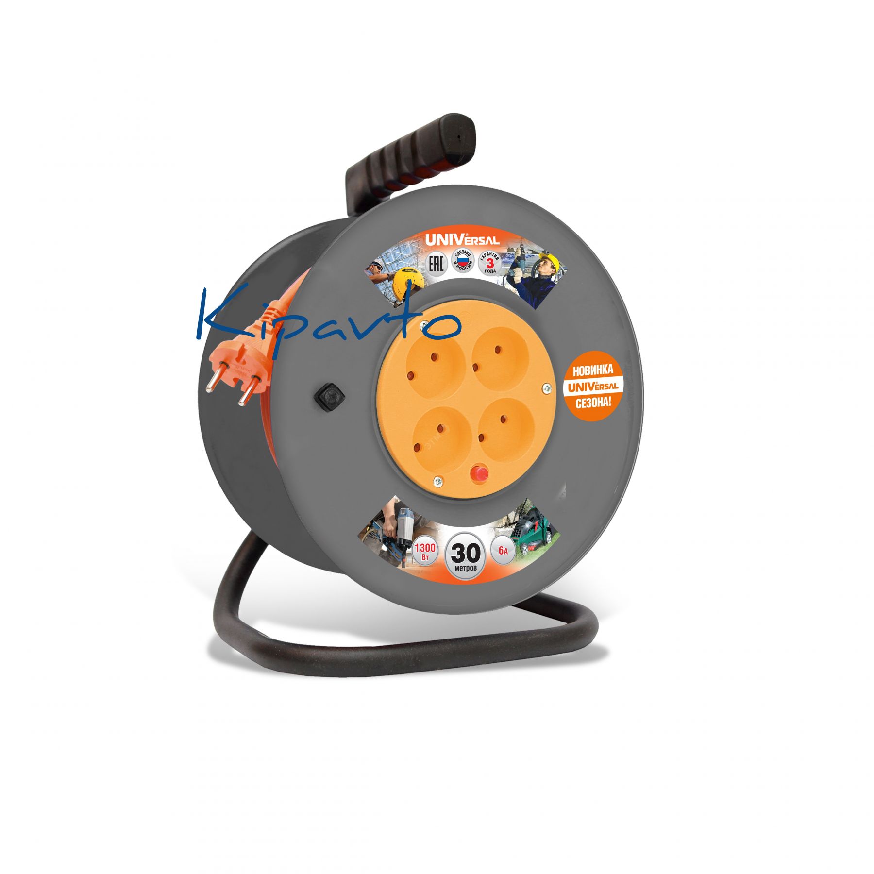 Цельнолитой корпус типа ''катушка'' изготовлен из полипропилена первичной переработки. Эргономичная изолирующая ручка – дополнительная защита от поражения электрическим током. Стойка – из трубы диаметром 18 мм, толщиной стенки 1 мм. Сетевой шнур изготовлен из провода ПВС и армирован неразборной литой вилкой. 4 гнезда розеток. Реле защиты от перегрева, предохраняющее удлинитель от перегрузок. Провод марки ПВС (ГОСТ 7399-97) сечением 2x0,75 мм2.