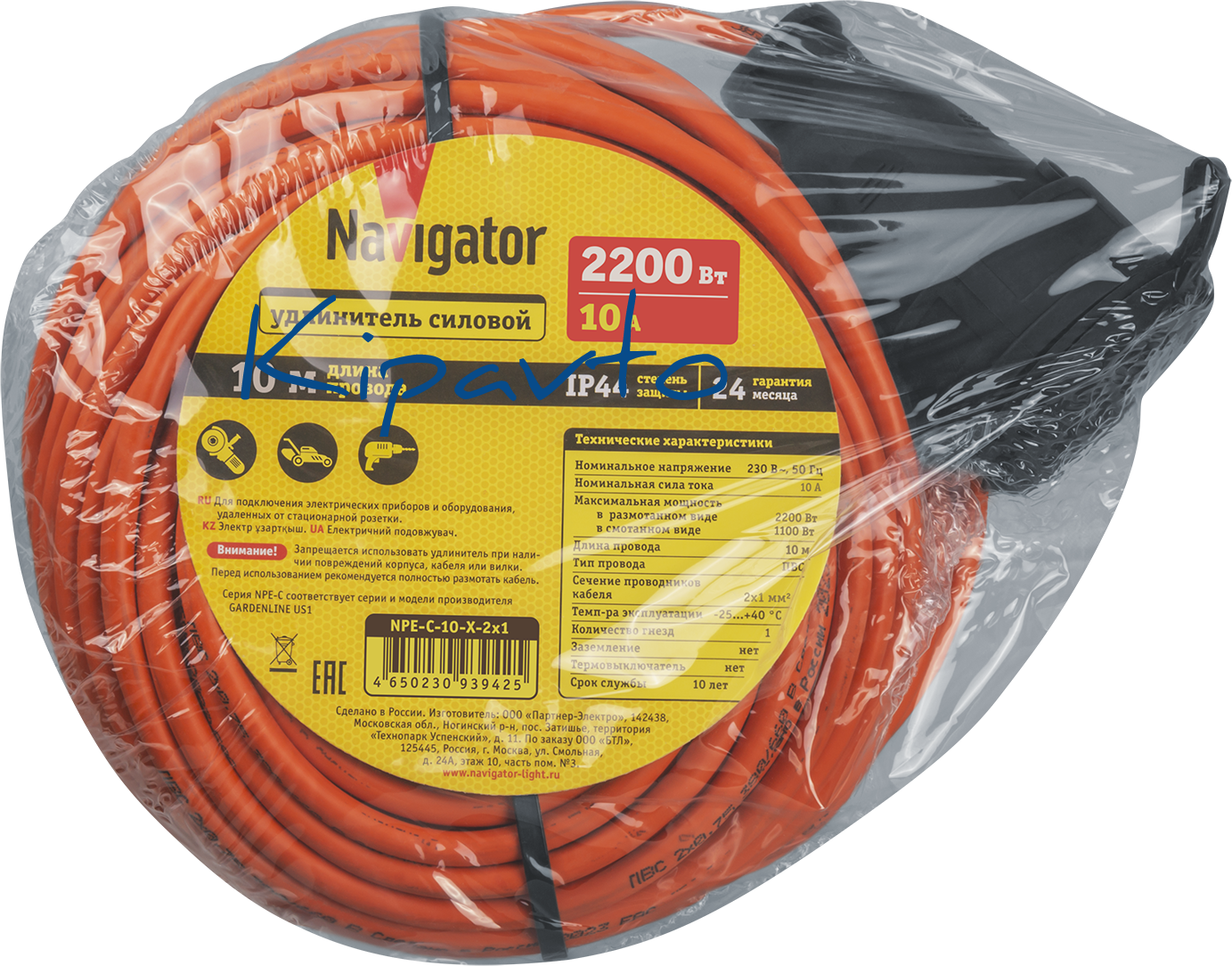 Удлинитель силовой NPE-C-10-X-2x1 шнур б/з 10м ПВС 2х1 2200 Вт IP44