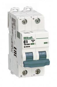 Автоматический выключатель серии ВА-105 DC DEKraft, 2P, ном. ток 1 А, характеристика C, откл. способность Icn 10 кА при 250 В/6 кА при 500 В, установка - на DIN-рейку, ширина - 1 мод. х 18 мм. Выключатели ВА-105 DC применяются для защиты от перегрузки и КЗ в цепях постоянного тока, в частности в системах автоматизации и управления, транспорта, генерации и распределения электроэнергии и др. Окошко-индикатор всегда показывает состояние аппарата вне зависимости от положения рукоятки управления.