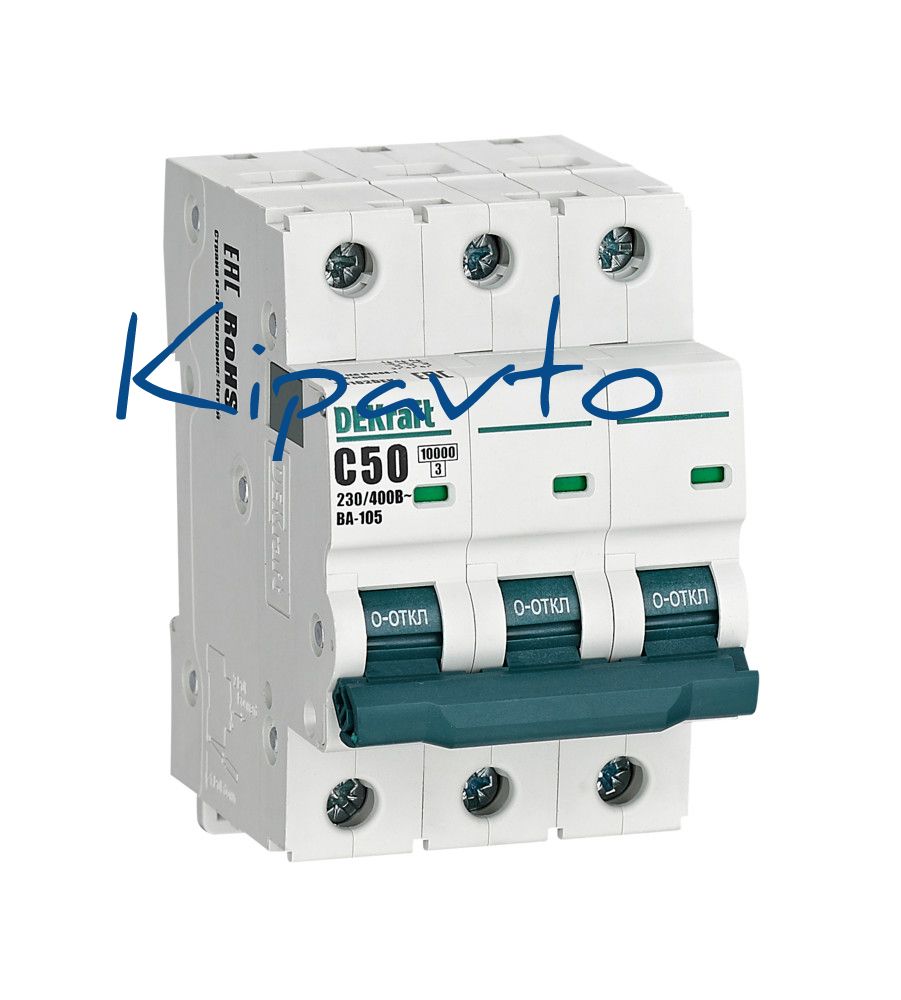 Автоматический выключатель серии ВА-105 DEKraft, 3P, ном. ток 50 А, характеристика C, откл. способность Icn 10 кА, установка - на DIN-рейку, ширина - 3 мод. х 18мм. Преимуществом выключателей ВА-105 является их высокая механическая и электрическая износостойкость — в 20 000 и 10 000 циклов соответственно. Аппараты ВА-105 имеют возможность применения независимых расцепителей на переменный и постоянный ток, а также возможность установки устройств на аппараты гребенчатых шин типа PIN.