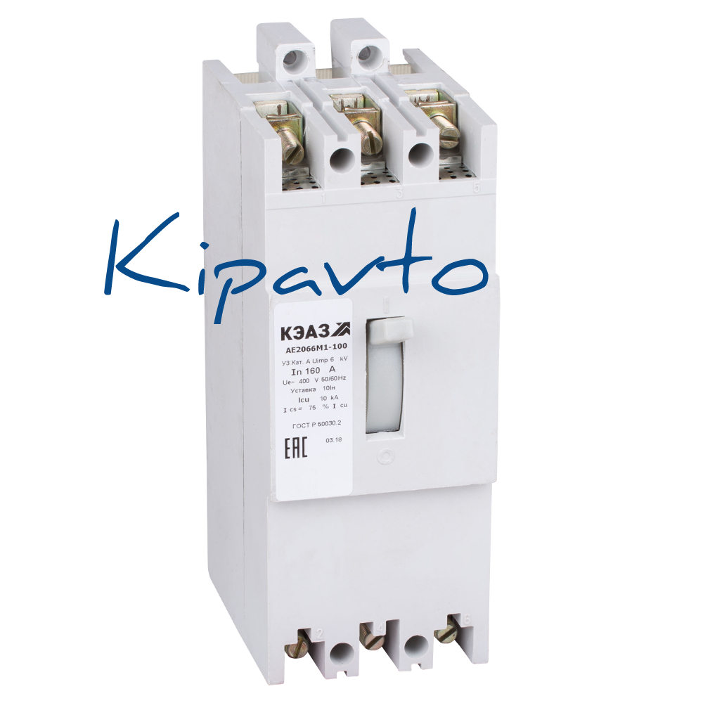 Силовой 3 полюсный автоматический выключатель переменного тока в литом корпусе на номинальный ток 160 А. Выключатели общепромышленного применения АЕ2040, АЕ2050М, АЕ2050М1, АЕ2060М1 КЭАЗ выпускаются в трехполюсном исполнении и предназначены для применения в электрических цепях переменного тока частоты 50, 60 Гц, на напряжения до 400В с рабочими токами до 160 А. Основное назначение выключателей серии АЕ20 - защита кабелей и проводов, а также асинхронных электродвигателей.