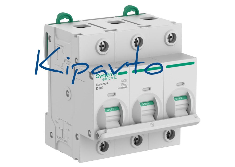 Автоматический выключатель S9НH, серии Systeme9, Systeme Electric, 3-полюсный, номинальный ток 100 А, характеристика D, Icn - 10 кА, Icu - 10 кА. Соответствует требованиям стандартов ГОСТ IEC 60898-1 и ГОСТ IEC 60947-2. Применяется в электрических сетях напряжением 400 В. Предназначен для защиты цепей от перегрузок и токов короткого замыкания. Оснащен безопасными клеммами с увеличенной до 50мм2 присоединительной способностью, механизмом мгновенной коммутации, индикаторами состояния контактной группы и срабатывания по причине аварии. Монтируется на DIN-рейку при помощи двухпозиционных защёлок, с возможностью демонтажа без снятия шины