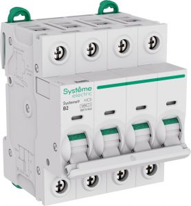 Автоматический выключатель S9FH, серии Systeme9, Systeme Electric, 4-полюсный, номинальный ток 2 А, характеристика B, Icn - 10 кА, Icu - 15 кА. Соответствует требованиям стандартов ГОСТ IEC 60898-1 и ГОСТ IEC 60947-2. Применяется в электрических сетях напряжением 400 В. Предназначен для защиты цепей от перегрузок и токов короткого замыкания. Оснащен двойными безопасными клеммами раздельного монтажа проводников, механизмом мгновенной коммутации, индикаторами состояния контактной группы и срабатывания по причине аварии. Монтируется на DIN-рейку при помощи двухпозиционных защёлок, с возможностью демонтажа без снятия шины