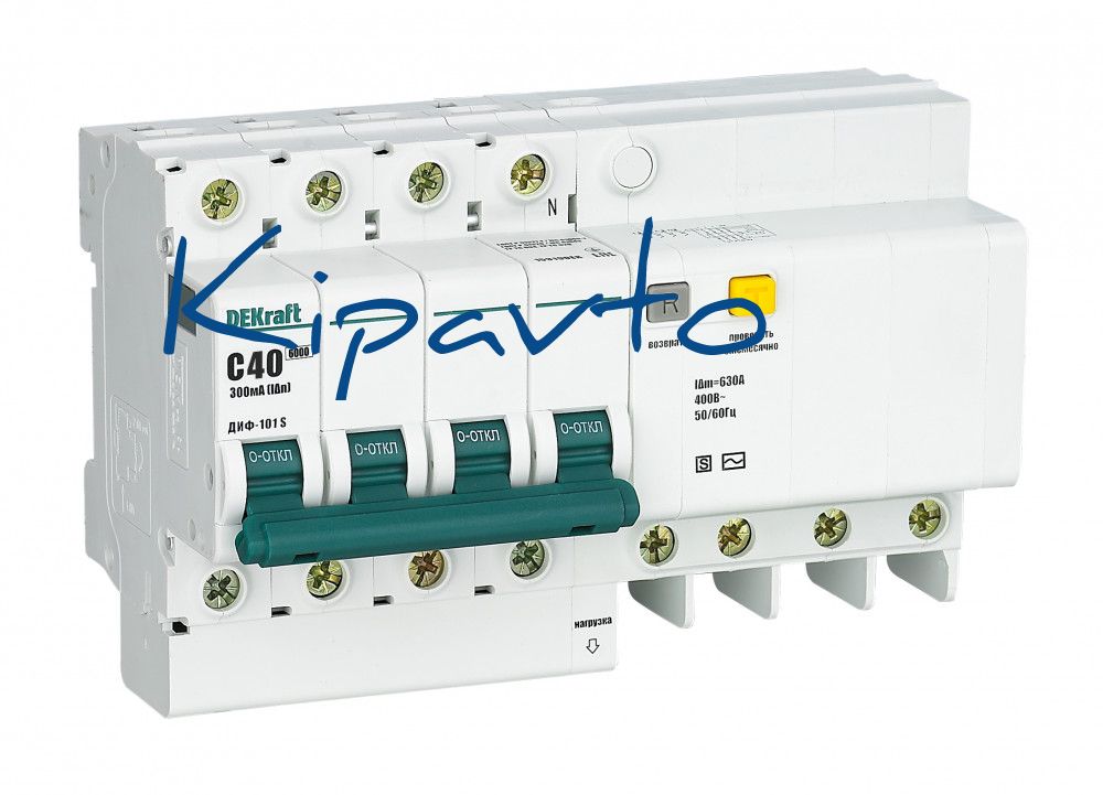 Автоматический выключатель дифференциального тока серии ДИФ-101 S DEKraft, селективный, 4P, ном. ток 40 А, характеристика C, откл. способность Icn 6 кА, ток утечки 300 мА, блок дифф. защиты - электронный, ширина - 8 мод. х 18 мм, монтаж - на DIN-рейку. АВДТ применяются в сетях напряжением до 400 В пер. тока для защиты электроустановок от сверхтоков и токов утечки, в щитах, где требуется ступенчатая дифференциальная защита (задержка по срабатыванию).