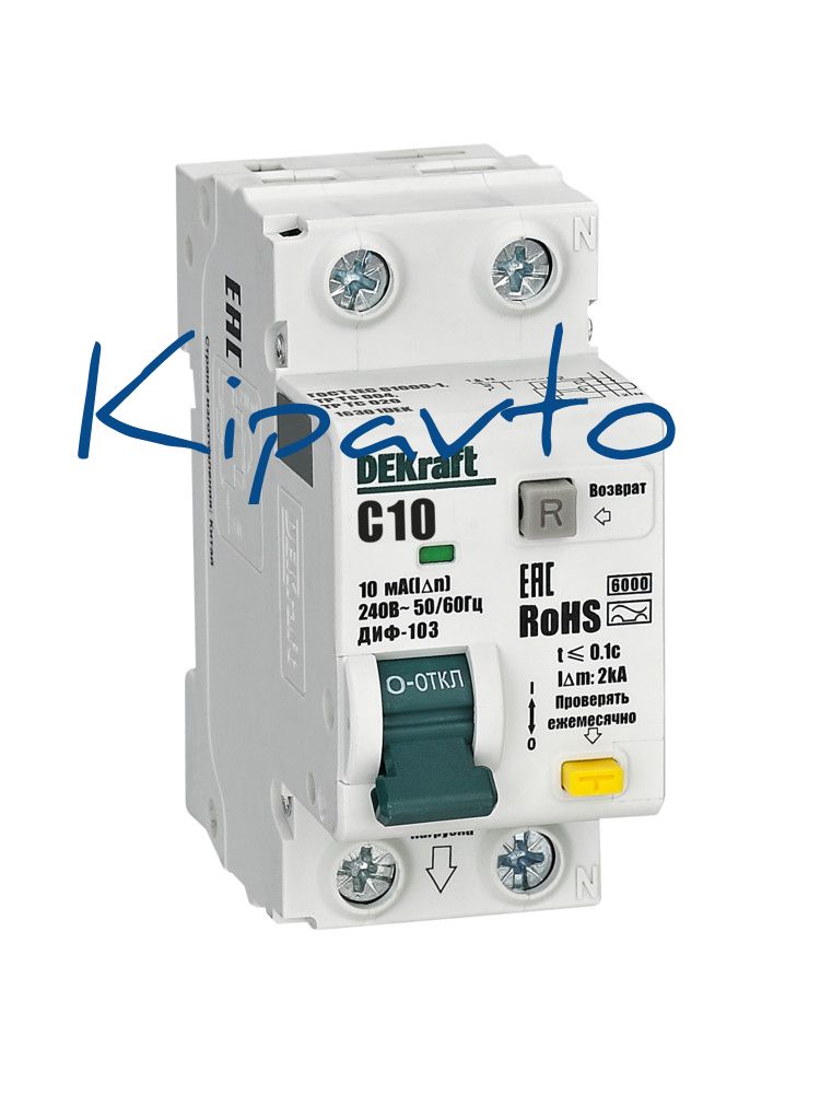 Автоматические выключатели дифференциального тока серии ДИФ-103 6кА NEW Dekraft, 1P+N, номинальный ток 10 А, ном. диф. ток 10 мА, тип диф. расцепителя - AC, кривая отключения - С, Icn, Ics 6 кА, тип устройства - электронный, монтаж – на DIN-рейку. АВДТ обеспечивают три вида защиты — от короткого замыкания, перегрузки и возникновения утечки тока (в частности, вследствие прикосновения человека к токоведущим частям). АВДТ с отключающей способностью 6кА применяются во вводно-распределительных устройствах (ВРУ), главных распределительных щитах (ГРЩ), осветительных и распределительных установках в общественных, административных, производственных, промышленных и других подобных зданиях.
