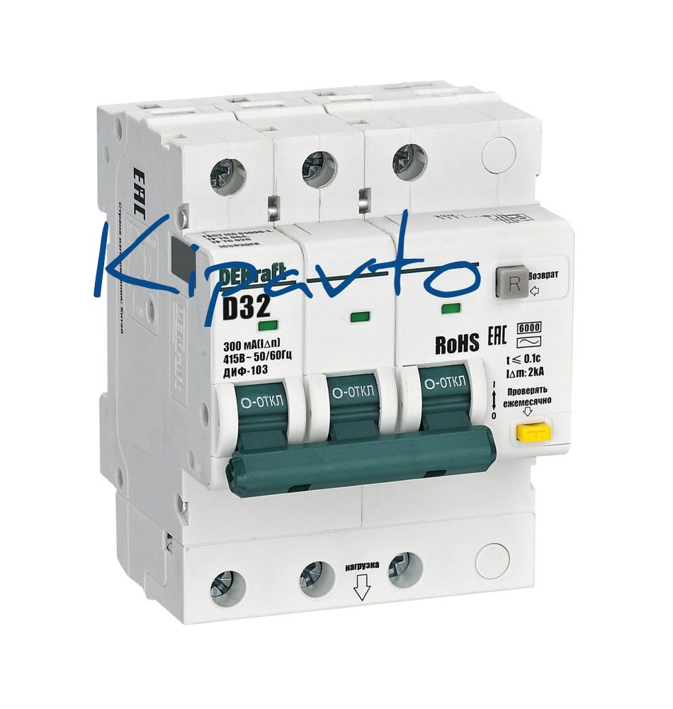 Автоматические выключатели дифференциального тока серии ДИФ-103 6кА NEW Dekraft, 3P, номинальный ток 32 А, ном. диф. ток 300 мА, тип диф. расцепителя - AC, кривая отключения - D, Icn, Ics 6 кА, тип устройства - электронный, монтаж – на DIN-рейку. АВДТ обеспечивают три вида защиты — от короткого замыкания, перегрузки и возникновения утечки тока (в частности, вследствие прикосновения человека к токоведущим частям). АВДТ с отключающей способностью 6кА применяются во вводно-распределительных устройствах (ВРУ), главных распределительных щитах (ГРЩ), осветительных и распределительных установках в общественных, административных, производственных, промышленных и других подобных зданиях.