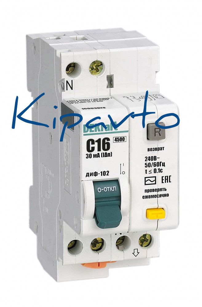 Автоматический выключатель дифференциального тока серии ДИФ-102 DEKraft, 1P+N, ном.ток 16 А, характеристика C, откл.способность Icn 4,5 kA, ток утечки 30 мА, тип - АС, блок дифф.защиты - электронный, ширина - 2 мод. х 18 мм, монтаж - на DIN-рейку. АВДТ применяются в сетях напряжением до 220 В пер.тока для защиты чеовека от поражения электрическим током и электроустановок от сверхтоков и токов утечки. Аппараты ДИФ-102 являются более компактным вариантом АВДТ по сравнению с серией ДИФ-101.