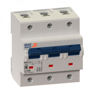Модульный автоматический 3 полюсный выключатель переменного тока с предельной коммутационной способностью при переменном токе 20 кА на номинальный ток 100 А. Модульные автоматические выключатели КЭАЗ на токи до 125А защищают оборудование от токов перегрузки и короткого замыкания в системах распределения электроэнергии и автоматизации технологических процессов. Соответствует стандартам ГОСТ Р 50030. 2.