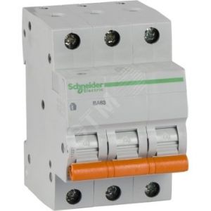 Автоматический выключатель ВА63 серии Домовой Schneider Electric, 3-полюсный, на номинальный ток 6А, характеристика С, с отключающей способностью 4500А, ширина 36 мм. Автоматические выключатели Домовой обеспечивают защиту цепей от токов перегрузки и короткого замыкания. Корпус выключателя сделан из инженерный полиамида – огнеупорного материала, стойкого к вибрациям и ударам. В передней части корпус имеет двойные стенки, что обеспечивает дополнительную защиту. Монолитная лицевая панель выключателей защищает человека от выхлопа раскаленных газов при коротком замыкании. Механизм мгновенной коммутации увеличивает срок службы контактов выключателей на 30%.